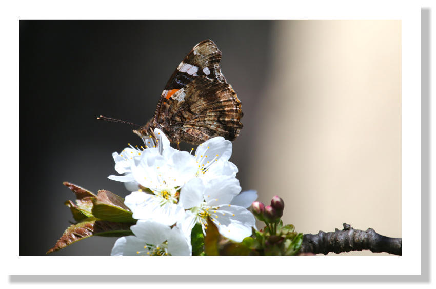 Unterseite der Flügel. Der Körper des Admirals ist schwarz mit weißen Streifen auf der Unterseite. Die langen braun gefärbten Fühler